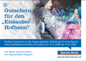 Am 11.01.2026 lädt der Hofheimer Wohnungsbau zwischen 11.00 Uhr und 15.00 Uhr kostenfrei zum Schlittschuhfahren ein (Schlittschuhverleih nicht enthalten).